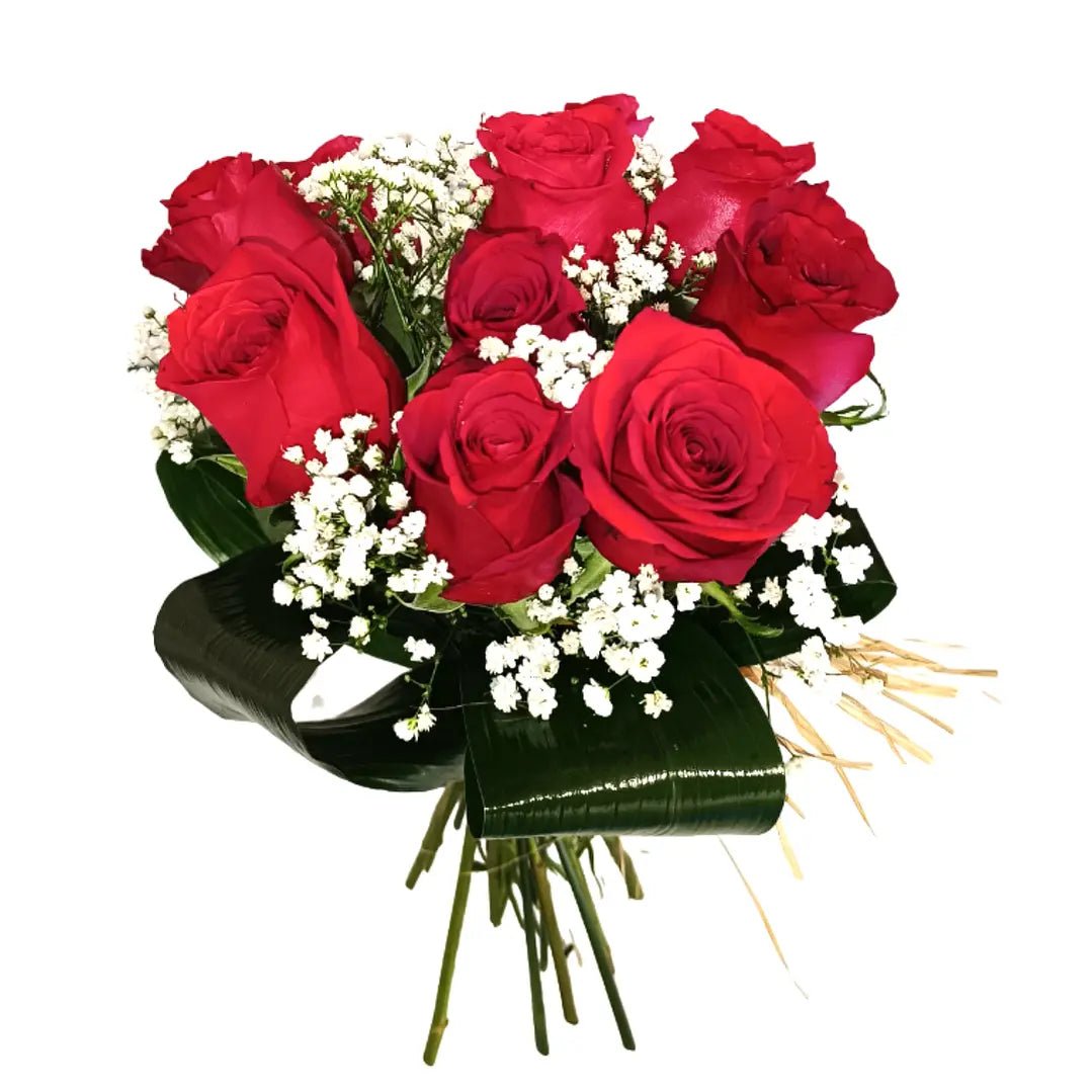 Un geste simple mais inoubliable. Ce bouquet élégant est composé de roses rouges fraîches, délicatement associées à de la gypsophile blanche et à des feuillages verts qui mettent en valeur toute la beauté des fleurs.